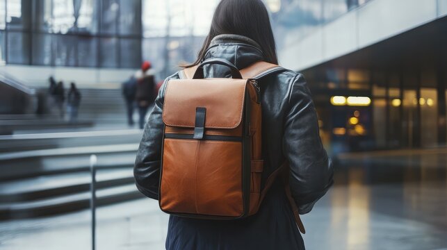 A woman wearing a brown backpack and a black jacket