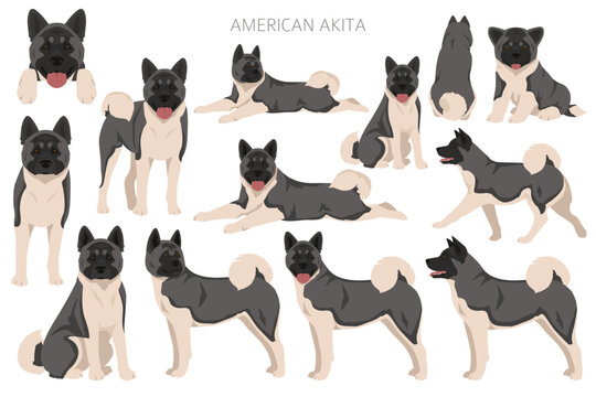 American Akita dog clipart. All coat colors set.  Different position. All dog breeds characteristics infographic