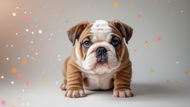 Top view as dog lies against white background. The English Bulldog is a purebred dog with a pedigree. The breed of dog belongs to the moloss group.