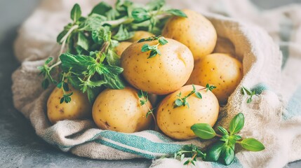 Bunch of potatoes are sitting on a cloth with some herbs on top. The potatoes are all different sizes and are arranged in a pile. The herbs on top of the potatoes give the scene a fresh