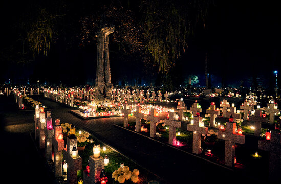 A serene cemetery scene during All Saints' Day. A gravestone adorned with yellow and red flowers, surrounded by lit candles. Autumn leaves cover the ground.
