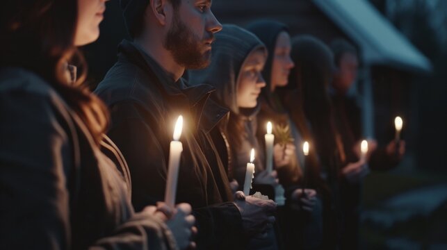 A line of people stands in the evening air, each holding a candle, as their warm glow illuminates faces in a quiet, reflective moment.