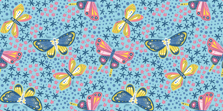 motif au rapport de papillons rose et bleu et de petites fleurs pour impression en série