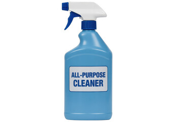 Blue plastic spray bottle with white and blue trigger sprayer and label reading All- Purpose Cleaner isolated on a transparent background