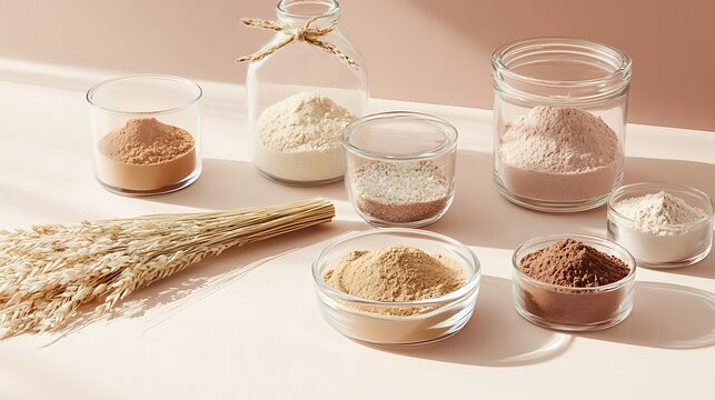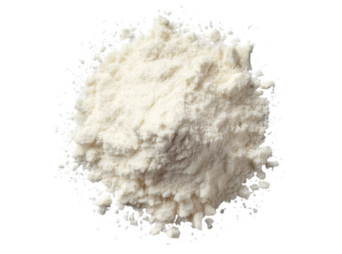 A mound of fine white flour artfully piled high within a polished wooden bowl on a clean white background