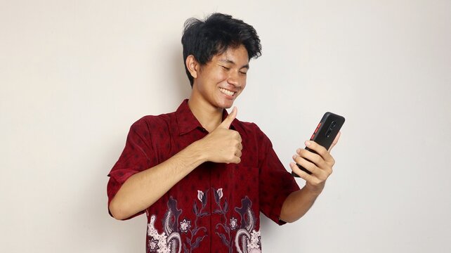 happy young handsome asian man in batik shirt posing okay or yes to smartphone