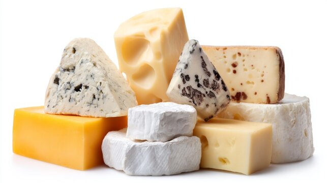 A colorful assortment of cheeses, each with unique shapes and textures, is beautifully arranged on a platter. These cheese varieties invite taste exploration during a festive gathering or event