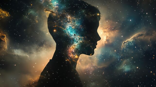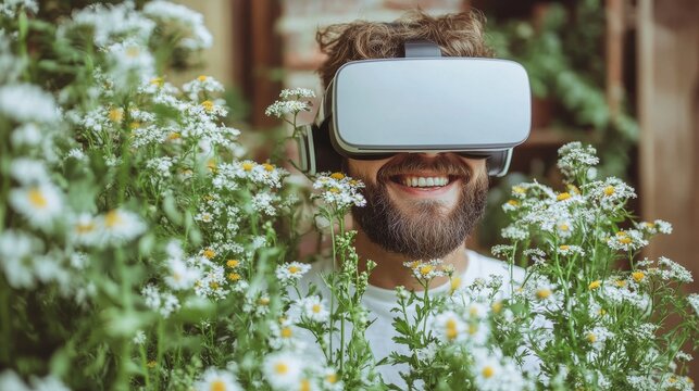 A man with a VR headset is deeply engaged in a lively artificial world, utilizing advanced tech and AI to explore a future where all things are achievable