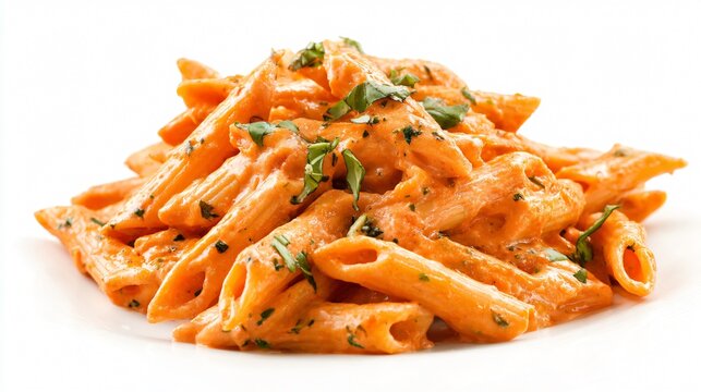 Penne allay Vodka pasta in a pink tomato cream sauce isolated on white background.