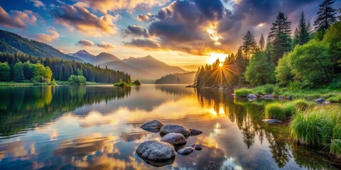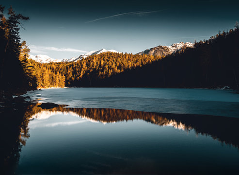 Sonnenaufgang am Eibsee in den bayerischen Alpen