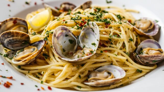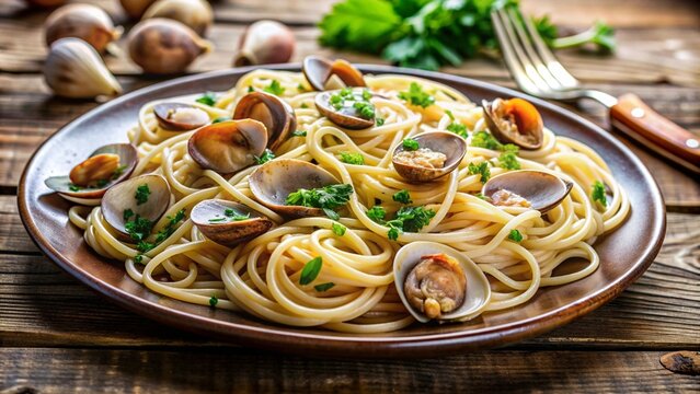 A mouthwatering plate of Italian spaghetti alle vongole, pasta with fresh clams, garlic