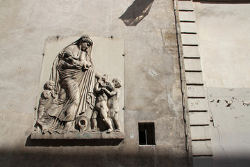 mythologic or allegoric sculpted decor on a wall in paris (france)