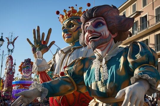 Vibrant carnival parade in Viareggio, Italy. Colorful allegorical floats with creative designs, festive atmosphere, people wearing masks, costumes, dancing, celebrating. Joyful crowd gathered along