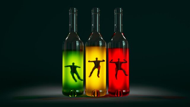 The allegoric scene with a drunk men swimming in a bottles on dark background