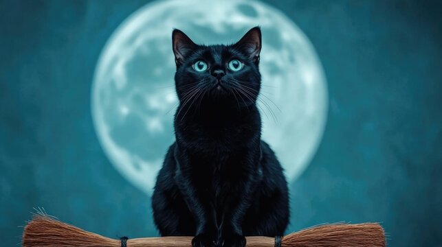 Mystical Black Cat Sitting on a Broomstick Under the Full Moon Spooky Halloween Pet Concept   Feline familiar witch s companion supernatural occult pagan allegoric surreal digital art manipulation