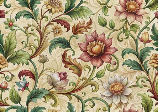 Intricately illustrated, ornate Victorian floral pattern features lush foliage, curled tendrils, and exotic flowers in rich, muted hues on a soft, cream-colored background.