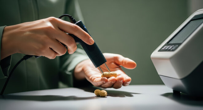 Scientist uses portable device to analyze chemical composition of single peanut in laboratory setting for food safety and allergen detection research