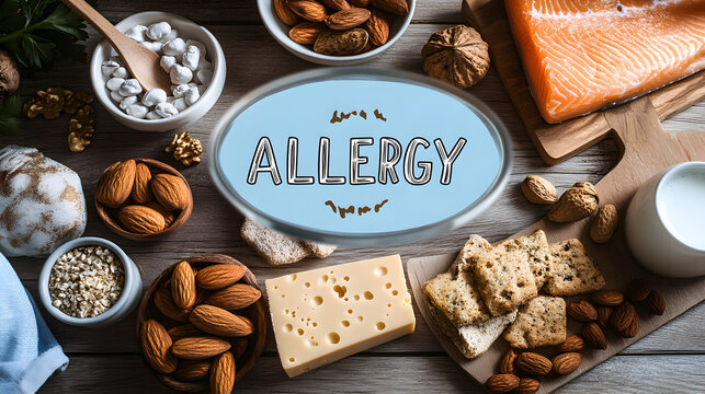 Image depicting common allergenic foods including nuts, eggs, milk, cheese, fish, and wheat with the word 'allergy' in the center.