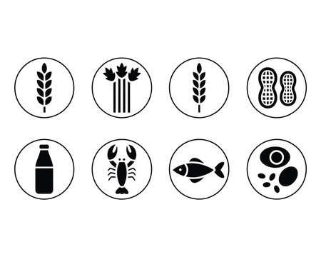 Common Food Allergen Icons Set in Black and White for Easy Identification and Safety Awareness