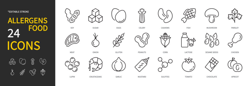 Allergens food icon set. Soy, sugar, eggs, celery, fish, meat, onion, gluten, lactose, sesame seeds, chicken, lupin, crustaceans, mustard, sulfites, tomato, etc. Vector illustration. Editable stroke.