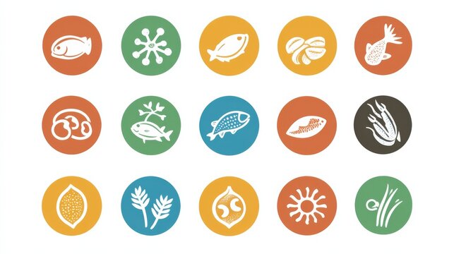14 round food allergens icon. Vector set of 14 icons. Collection includes gluten, fish, egg, crustacean, peanut, lupin, soya, milk, trees nuts, mustard, sesame, sulphur dioxide.