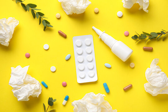 Spring allergy relief items: tissue box, lemon, herbal tea, and essential oil