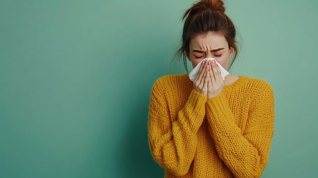 Woman Sneezing into Tissue Against Green Background Depicting Allergies or Cold Symptoms