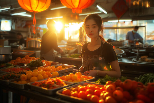 A community center offering free meals and resources to those in need, showcasing efforts to alleviate poverty.A woman is standing in front of a display of fruits and vegetables