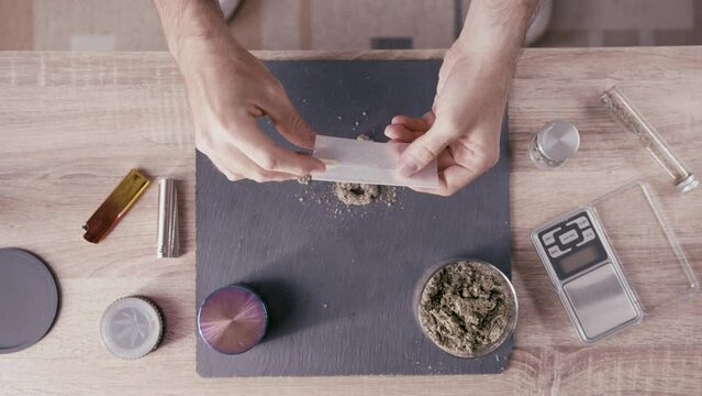 Top down view table, caucasian man rolls a marijuana joint in dealer environment