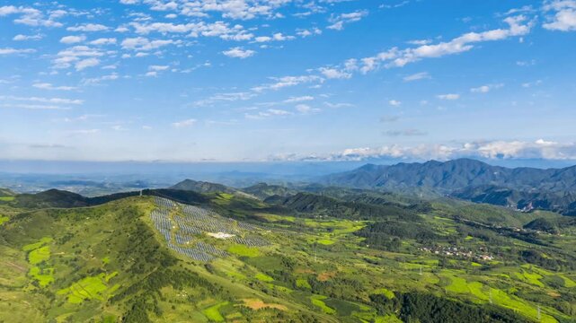 aerial time lapse video of the solar photovoltaic power station on the mountain slope against a pure sky, clean energy in mountain village , rural revitalization and poverty alleviation project