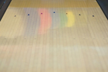 Colorful bowling bowl and pins on alley tenpin completion fun and entertainment evening family bowling party