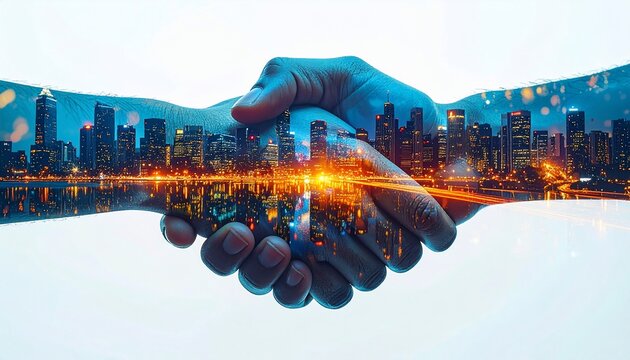 Business alliance concept: Handshake over city skyline symbolizing partnerships and growth