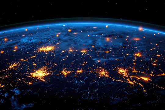 A futuristic neon globe outline surrounded by interconnected lines representing worldwide alliances on a stark black background --3:2 aspect ratio --size 50.