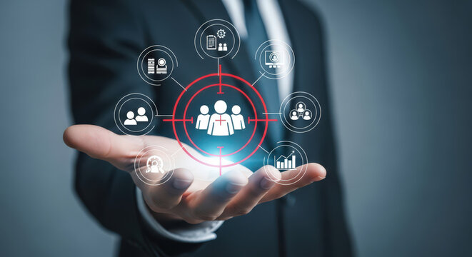 Executive Presenting Teamwork and Business Strategy Icons in Hand, Emphasizing Collaboration and Goal Achievement in a Corporate Environment with Modern Technology