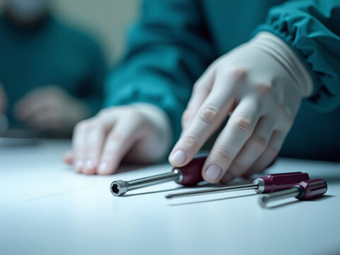 Préparation minutieuse d'instruments chirurgicaux stériles avant une intervention en bloc opératoire moderne