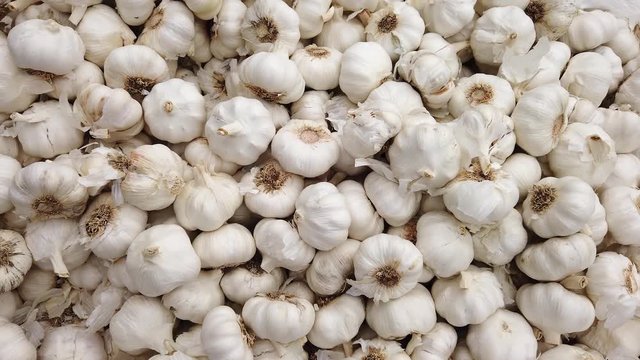 Slow motion tracking shot over a pile of white garlic bulbs, allium, sativum, on display on a market stall