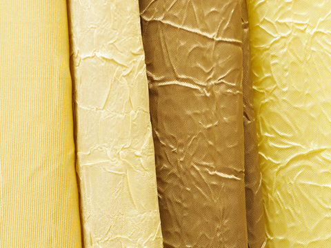 Yellow and brown color fabrics hang for sale in a store. The concept of fashionable clothes and interior