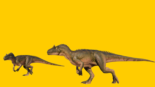 Three allosauruses kick up dust as they hunt along a rocky track created by the passage of large dinosaurs.  Three hunters on the prowl. 3D Rendering