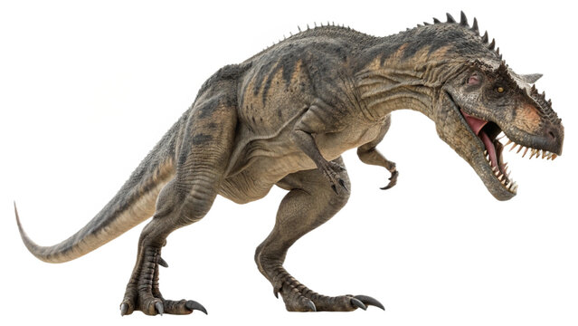3D rendering of Allosaurus walking to viewer, isolated on white background.