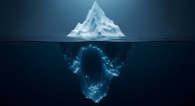 Massive iceberg with a vast submerged portion visible beneath the dark ocean surface symbolizing hidden danger and the unknown