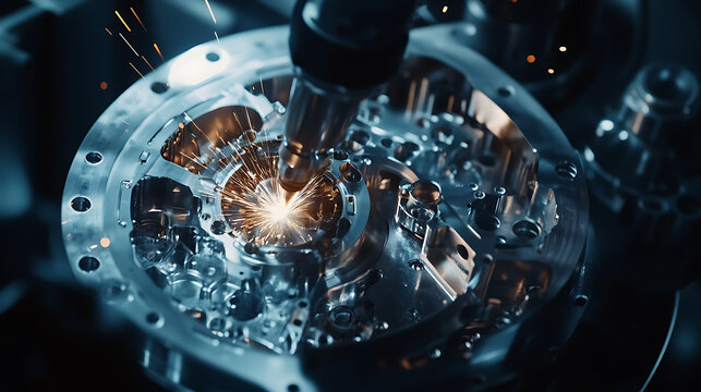 A robotic arm cutting and welding titanium alloy components for space shuttles in an advanced aerospace facility, sparks illuminating the cleanroom, Aerospace-tech style