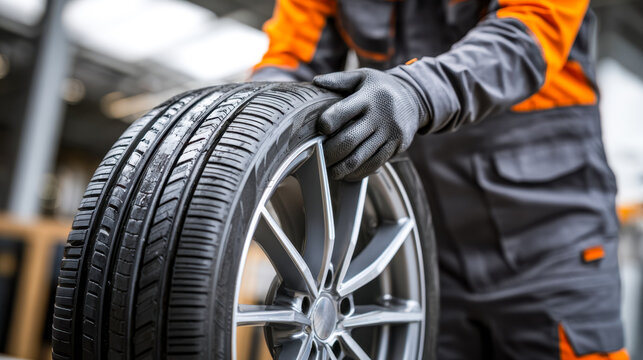 Person inspecting car tire and alloy wheel in an automotive workshop