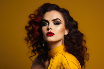 French model with alluring seductive expression, red lipstick and hand under chin, classy chic outfit aesthetic - isolated background, beauty studio photoshoot portrait.