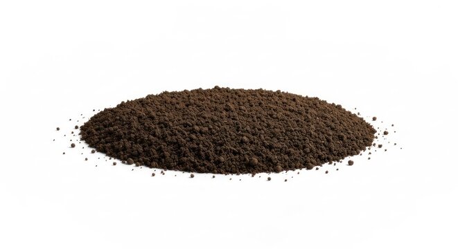 Pile of rich, dark brown soil on a plain white background, centrally lit