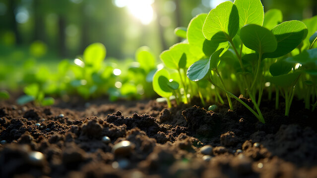 Fertile alluvial soil with thriving green plants, riverbank ecosystem, rich organic earth details.