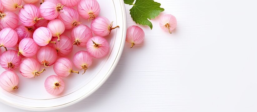 Top view of pink gooseberries on a white plate creating a vibrant copy space image for summer food with a berry harvest theme