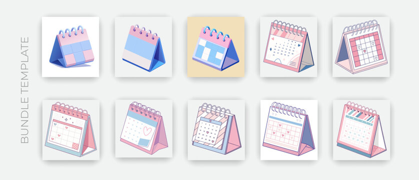 Calendar mockup with blank pages and spiral. Desktop vertical paper calender mock up front and side view isolated on white background. Agenda, almanac template. Realistic 3d vector illustration, set
