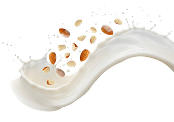 Fresh natural almond milk splash swirl with almonds isolated. Healthy splashing almonds milk or milkshake, almond seeds, yogurt splash. Organic vegan liquid splash dairy commercial.  3D