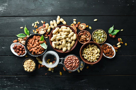 Assorted nuts on the old black background. Top view. Free space for your text.