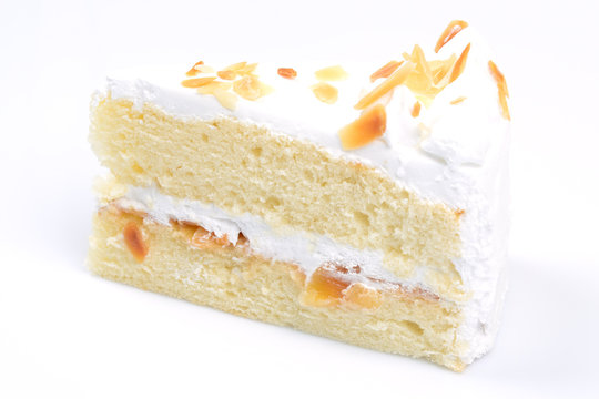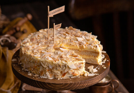 tasty homemade cake with two biscuit layers, white cream and almond flakes on wooden cake stand on rustic table